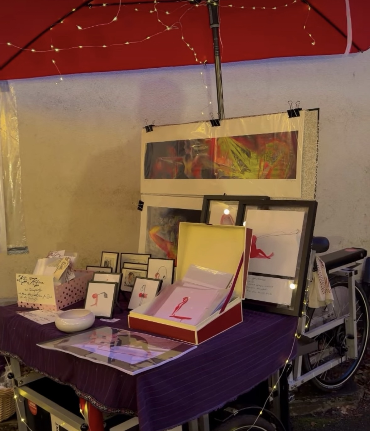Ich war bei dem ersten Winterzaubermarkt im Haferkamp 2, im Hof meiner KungFu-Schule dabei. Mit dem Lastenrad und meiner Kunst, die du auch in meiner Galerie ansehen kannst, konnte ich dort ein paar nette Leute treffen und Erfahrungen sammen. War eine tolle Veranstaltung!