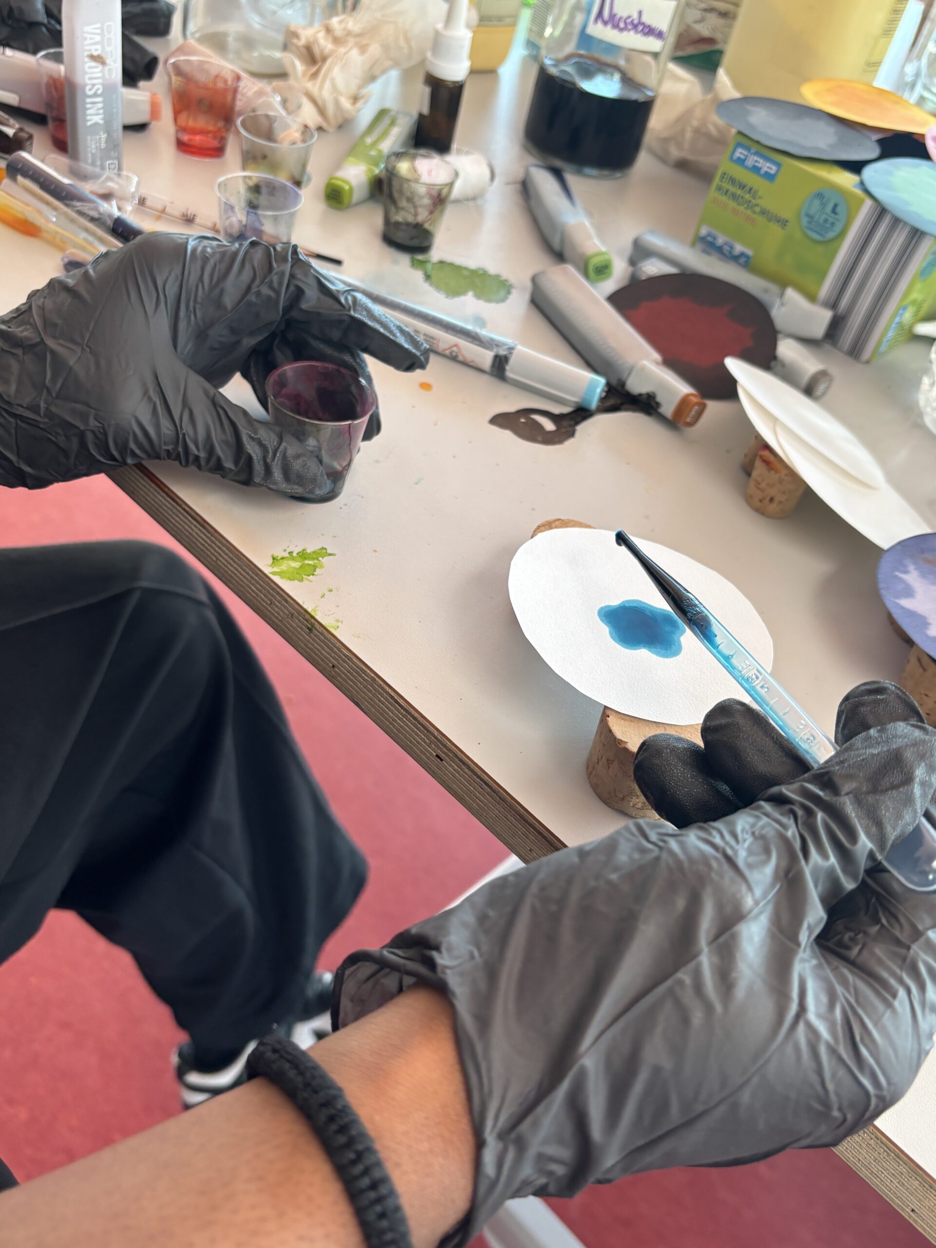 Stoffe werden als aktive Akteure erfahrbar. Neben anorganischen Reaktionssystemen treten organische Farbstoffe in Dialog: Tinten aus dem Färbergarten, Copics-Nachfülltinten sowie Lebensmittelfarben. Untersucht werden Diffusion, Grenzbildung, Pigmenttrennung, Emergenz, Viskosität und Lösungsmittelunterschiede.